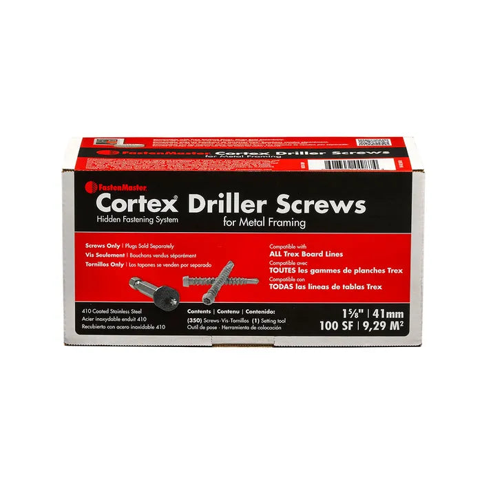 The Cortex - Aluminum Driller 9.3 m² pack contains 350 self-drilling screws designed to fasten composite or PVC deck boards to aluminum or steel framing, creating a hidden fastening system by creating a pocket for compatible Cortex plugs (sold separately) to conceal the screw heads. The system is ideal for aluminum framing and provides a clean, screw-free surface once the plugs are installed with a hammer.